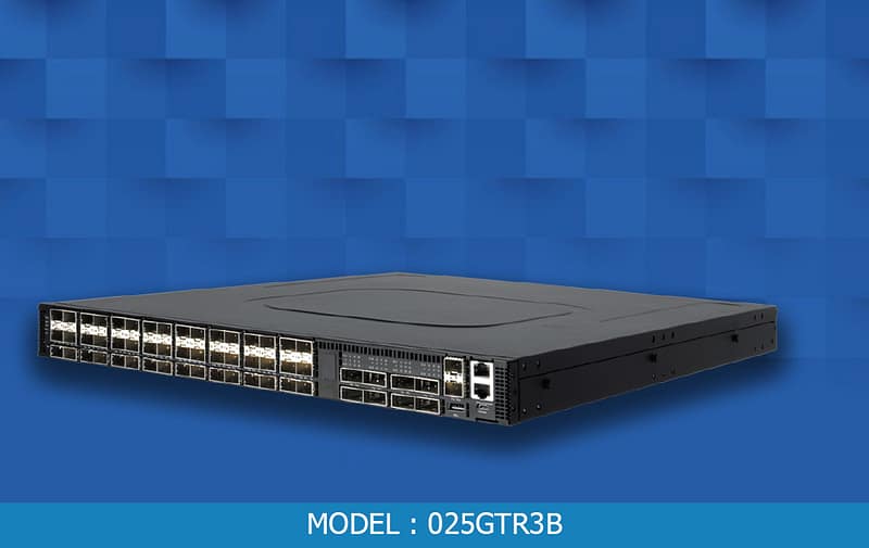 The 025GTR3B baremetal appliance is a Top-of-Rack (TOR) appliance for high-performance data centers. In a compact 1RU form factor, the DSSOLDQFH provides line-rate L2 and L3 switching across the 48 x SFP28 + 8 x QSFP28 ports, and each QSFP28 port can be configured as 4 x 25 GbE, 1 x 40 GbE, or 4 x 10 GbE by using DAC breakout cables. The *75% can be deployed as a TOR switch depending on the operating system installed by user supporting 10/25 GbE to servers with 40/100 GbE uplinks. This open network switch is loaded with the Open Network Install Environment (ONIE), which supports the installation of compatible Network Operating System (NOS) soſtware, including the open source plus commercial NOS offerings.